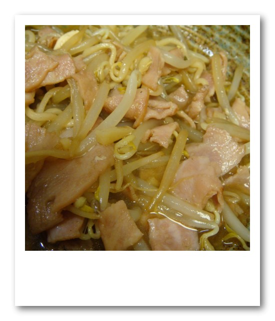 1.熱したフライパンにごま油、ニンニク、ハム、もやしの順に入れて炒める