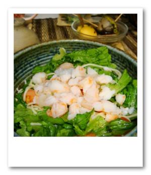 3.サラダ、パスタ、(A)のドレッシングを絡め器に入れ、海老をのせたら出来上がり!