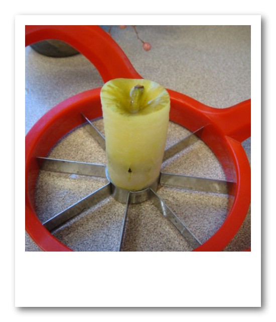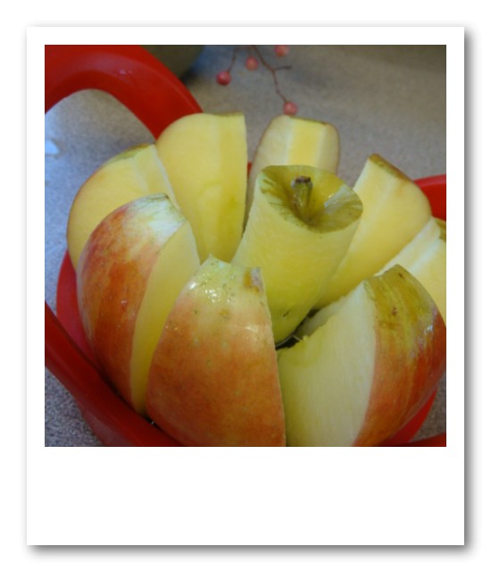 これだったら、アップルカッターをりんごの上に置いて勢いよくしたにおろせばあっという間に綺麗にスライス。中央の芯はしっかり残してくれます。
