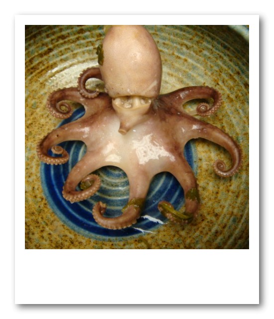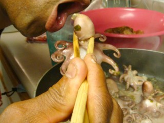 材料は上記と同じようにニラ、パクチー、ごま油、レモンに海老をタコに変えて伝えたのだけれども、タコを小さく切らなかったので、こんな姿で調理されてしまった(汗)